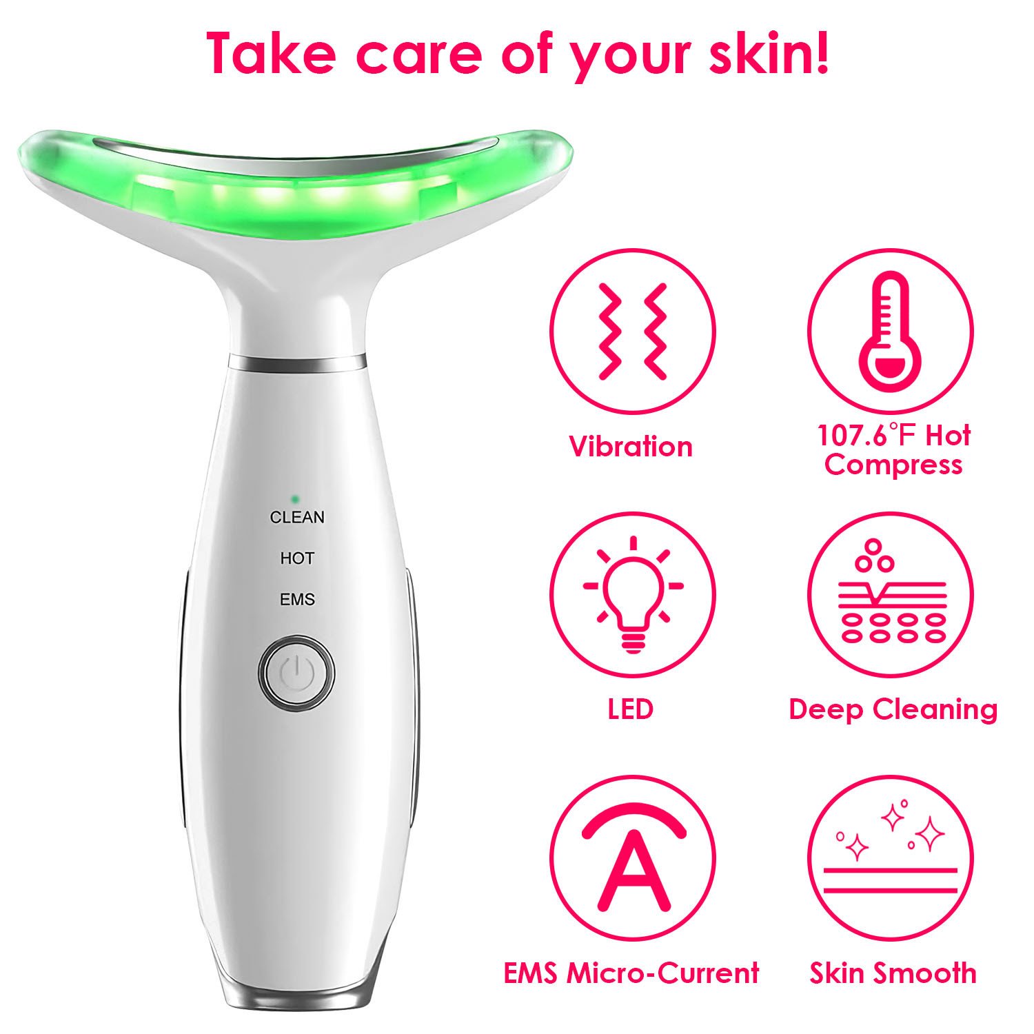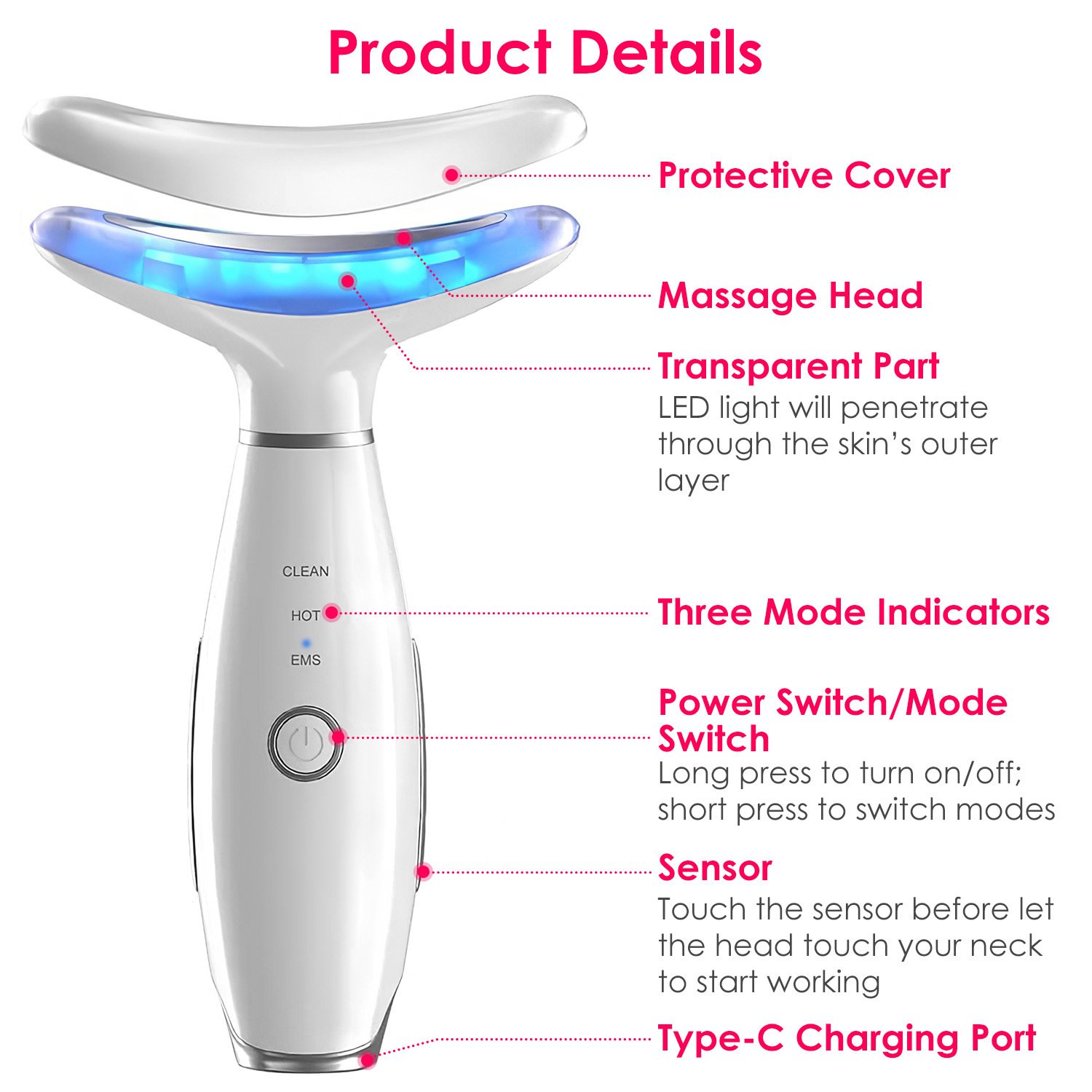 *Usage Methods*:Apply skin care products like creams; lotion or essence on your neck/face/other skin evenly; long press the power switch to turn on the device and short press to choose a mode then hold the massager head to lift the neck from bottom to top. You can also press; squeeze; caress or push your skin with the massager head to help absorb the creams or lotion faster. Use it 1 time a day and 5 minutes each time to improve your skin elasticity and maintain healthy glowing skin.