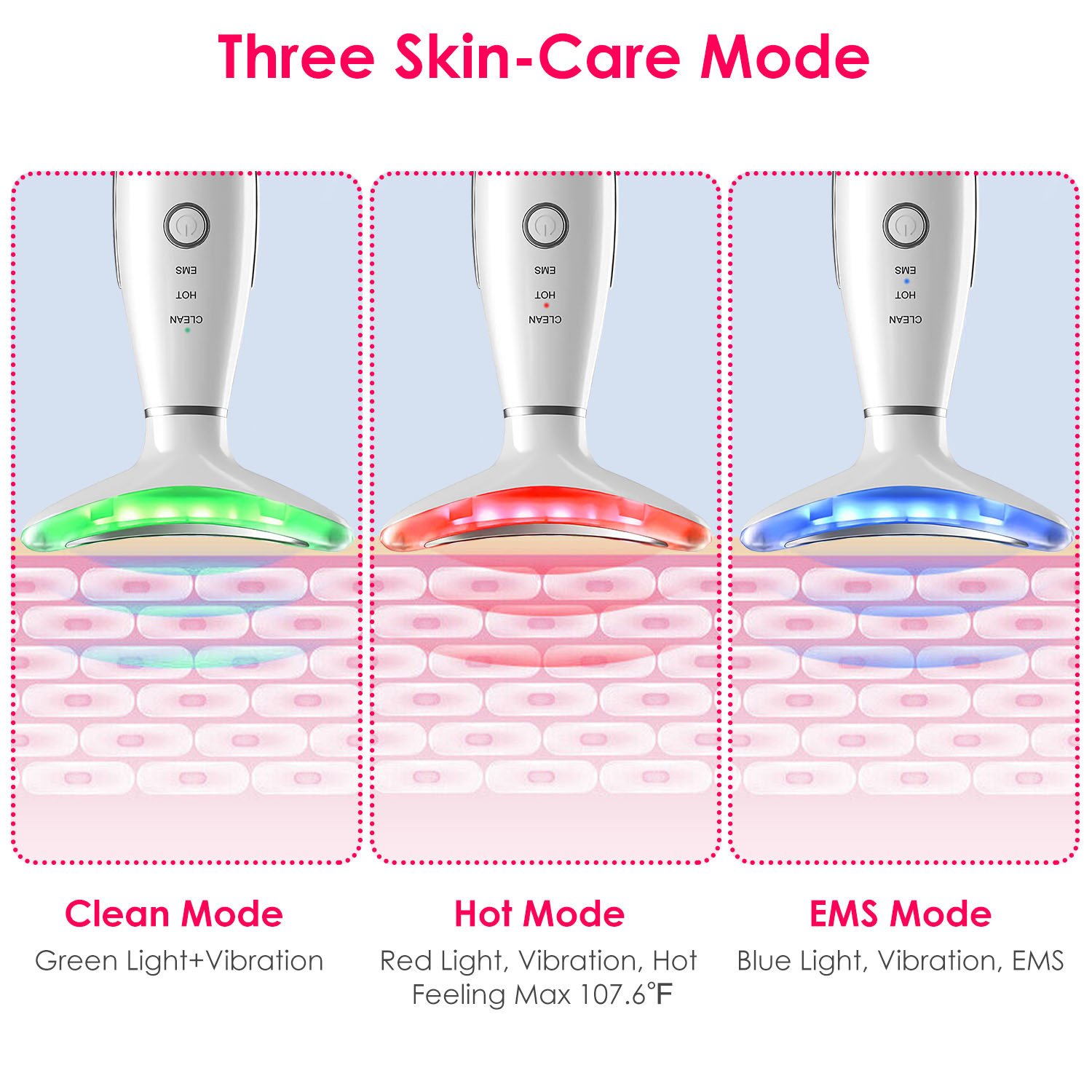 Mode: Clean(Green Light; Vibration); Hot(Red Light; Vibration; Hot Feeling Max 42℃/107.6℉); EMS(Blue Light; Vibration; EMS)
